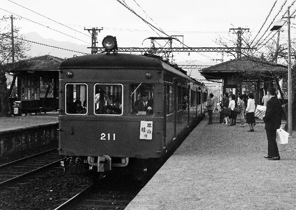 晩年の嵐山線でのスナップで、窓から顔を出しているのは鉄研の学友。(2004年4月 M・N)