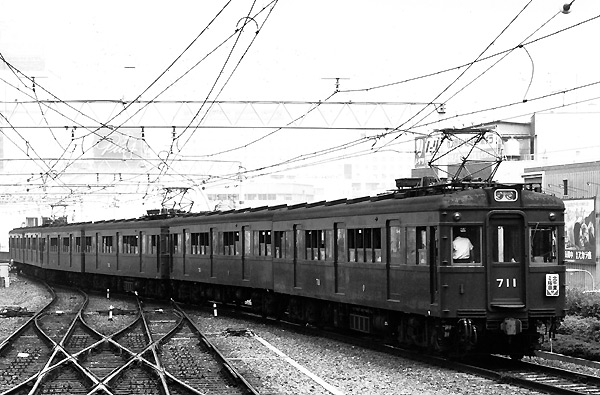 MNによる阪急こだわりの友情出演3回目のその2は京都線の711です。 710形は昭和25年から28年にかけてMc+Tcが7本製造されています。 神戸線の810系とは同車体ですが、こちらは600V・1500Vの複電圧車でした。 (2003年8月 H・T)