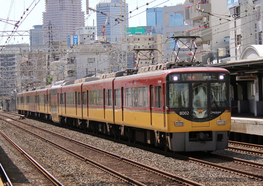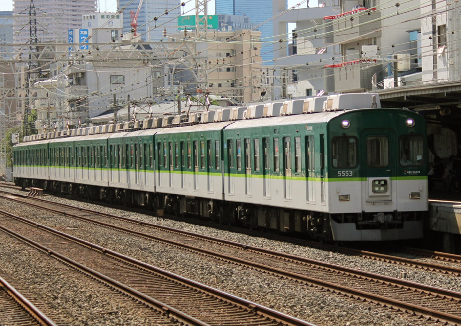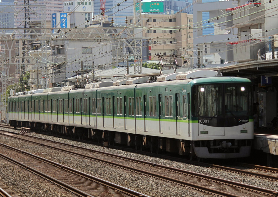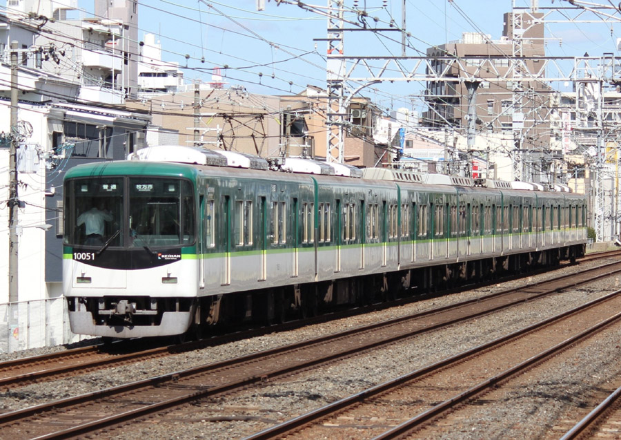 今回のトップナンバーは京阪電鉄の車両です。会社に勤め始めた頃は、通勤で使い、 関東へ異動してからも、本部が京阪電鉄沿線にありましたので、よく乗車していました。 しかし、勤めを辞めてからは乗車することがなくなり、 雑誌などで新車情報を見るだけになりました。ところが、 2017年(平成29年) 6月から8000系で運転される特急列車に座席 指定有料特別車両「プレミアムカー」の営業が開始されました。 これは「乗らねば!」と思いつつ、1年半後にやっと乗車することができました。 指定の列車まで時間があり、野江駅で京阪列車の撮影をしました。 すると、ホームに10000系トップナンバー編成が、普通列車として入線してきました。 私の頭の中では、支線で運転されていた1900系や2600系の置き換えを目的として 4両編成で登場した車両と思っていたので、 7連となり本線で運用されていたことにビックリしました。たまには乗ることも良いですね。
