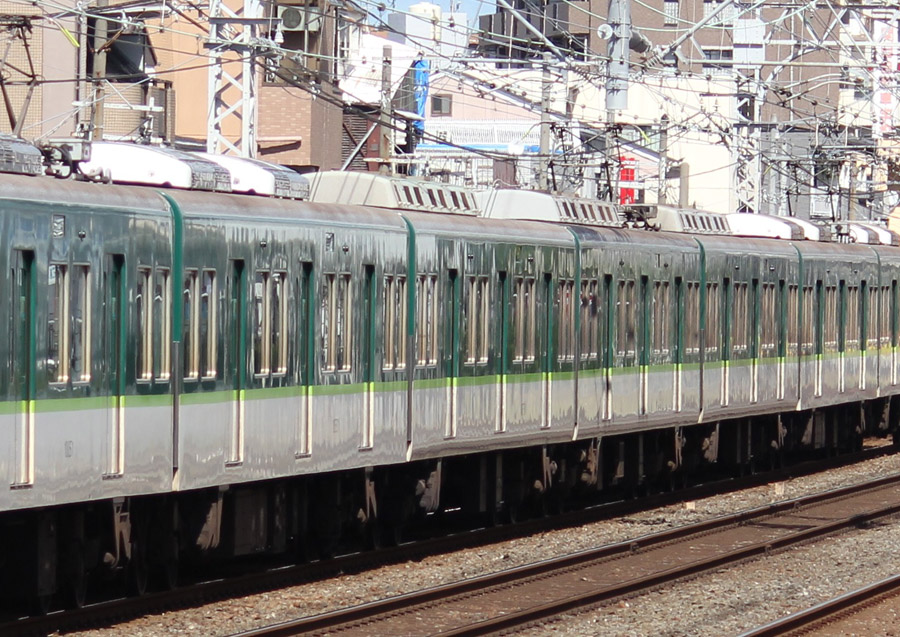 さて、10000系前述のように、交野線、宇治線で運用されていた1900系や 2600系の置き換えとワンマン運転実施を目的とし、2002年(平成14年)から営業を開始しました。 2002年に4両編成3本、2006年追加で3本の計6本が製造されています。 アルミ車体で7200系をベースに開発されていますが、 バリアフリー対策として台枠を20mm薄くして床面を20mm下げました。 そのため、7200系にはあった車体裾の絞り込みが廃止され、 屋根高を10mm上げ、客扉が上に10mm拡大しています。登場時は、 従来採用していた緑の濃淡塗装から、ターコイズグリーン一色となり異彩を放っていましたが、 2009年から他車と同様に新塗装化されました。 また、後継車種として、13000系が投入され、6本で製造が終了しています。