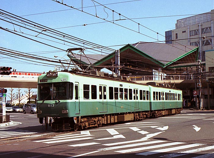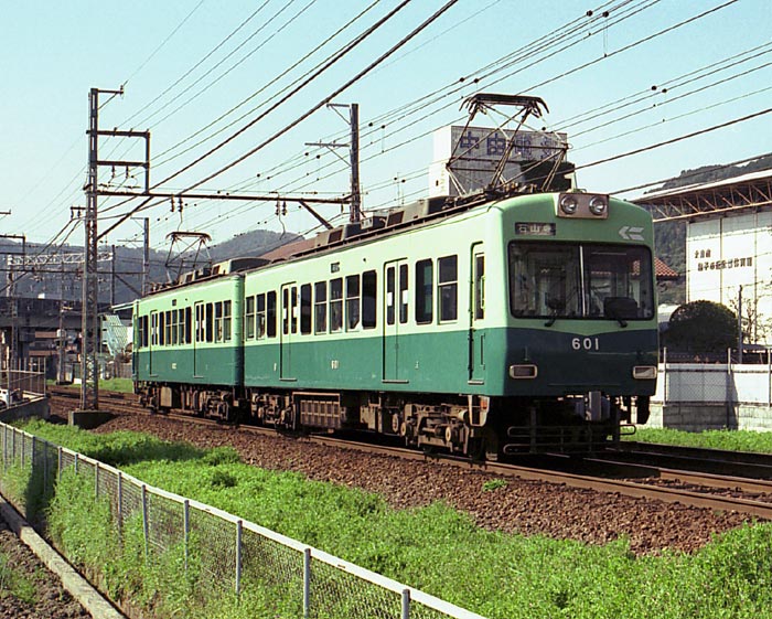 京阪は好きな私鉄なんですが、写真を撮ったことは数えるほどしかありません。 関西には目的が多いので、その中での優先順位の問題なんですね。 地元では身近過ぎてなかなか写真を撮らなかったりしますが、 T.O.も同じだったようです。(2006年8月 H・T) 滋賀県に11年在住し、京阪の大津線(石山坂本線〔いしやま・さかもと・せんと読み、 “ほんせん”ではありません〕と京津線〔けいしん・せん〕の総称です)は身近な鉄道であったのですが、 ほとんど写真を撮っていませんでした。会社へは車通勤で、 身近な交通機関でなかったことに起因しているのかもしれません。 しかし、京都の祇園へ飲みに行くときなどは山科で京津線に乗り換え 三条経由で四条まで行っていましたので、準急はほとんど600形に置き換わっていましたが、 500形準急や80形各停にも数え切れないほど乗車をしています。 今思えば、一枚でも写真を撮っておけばと後悔しています。そんな訳で、この601を撮ったのは、 滋賀県を離れてから2年後でした。 さて、601+602は、1984年(昭和59年)に大津線初の冷房車として登場しています。 500形に続く高性能車ですが、 2両8個のモーターを601に搭載したコントローラで制御するMc+M'cの2両ユニットにしたり、 回生ブレーキ、補助電源装置にSIV(静止インバータ)を導入するなど意欲的な車輌となっています。 車体は300形の客室部分を再利用していますが、前面を非貫通2枚窓とし、「く」の字形の半流線形として、 車体長を伸ばし、新製車の扱いとなっています。 当初は京津線での稼動が主でしたが、京都市営地下鉄が出来、 御陵(みささぎ)駅から乗り入れが始まると石山坂本線に活躍の場を移し、 さらに700形と下回りを共通化すべく電気指令式ブレーキ化、 バリアフリーに対応するための車椅子スペース設置、 さらには合理化のためのワンマン化改造をされています。 ちなみに、京阪にとって「600」を名乗る形式は3代目です。 初代は、京阪本線で日本初のロマンスカー1550形を改番したもの、 2代目は初代600形や初代700形の機器を流用した19m3扉の通勤車です。 この2代目は1500Vへの昇圧時に対応ができず、 3代目が登場する前年(1983年)に廃車になりました。 (2006年8月 T・O) |
