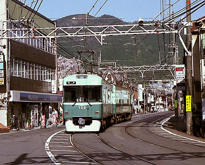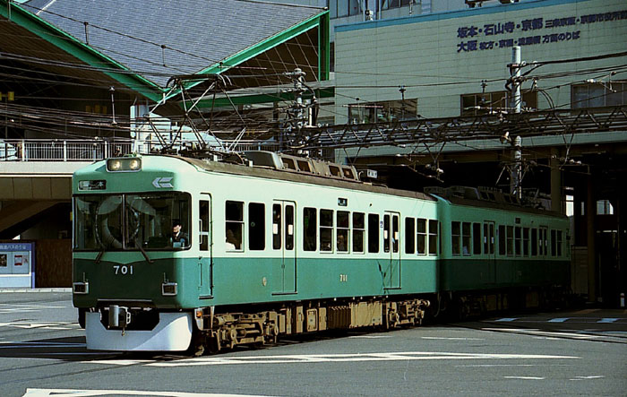 京阪は好きな私鉄と書いたのですが、実は京阪三条以北は対象外だったりしま す。蹴上付近の廃止以降は運転系統すらわかっていません。その昔に乗り潰しは したんですけどね。(2006年8月 H・T) この701+702は350形の車体を利用する形で1992年(平成4年)に誕生していま す。なお、350形の車体を利用したのは、最初の4輌のみで後は500形の車体を利 用しています。滋賀に移り住んで、慣れてきた頃でしたが、京阪601でもお話を した通り、近くに住んでいながらこの新車を撮影にいくこともありませんでした し、見に行くこともありませんでした。この700形は600形と見た目、大きな変化 がなかったことが一因としてあるかもしれません。 700形は600形の兄弟車のような存在です。ブレーキが電気指令式に変更された り、前面窓が傾斜のあるものから垂直になったりしていますが、側面はほぼ同じ です。その理由は、元々は600形5次車として計画をされていましたが、1990年 (平成2年)京津線が乗り入れをする京都市営地下鉄東西線の車輌規格が決ま り、その内容に大津線全体を600V→1500Vへ昇圧することが含まれていました。そ の結果、1500Vに対応できる車輌として形式を700形と改め誕生しています。 この700形も600形と同じく3代目です。初代は本線の1550形を両運化、車体を 伸ばした1580形が改番し700形となり、2代目は旧型車輌の機器を利用した19m3扉 の通勤車です。この車輌は本線が1500V昇圧したときに3代目1000系に改造されて います。 京阪は6と7のつく形式は兄弟のような関係となることが多いようです。「600」 と「700」の初代、2代目、3代目はもちろん、京阪本線の6000系と7000系も兄弟 のような関係となっています。(2006年8月 T・O) |