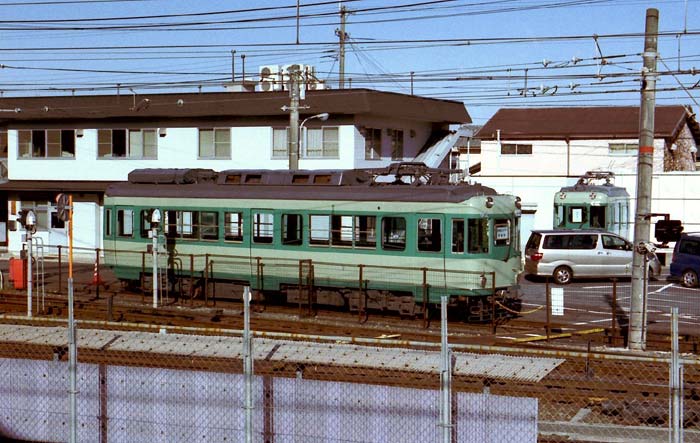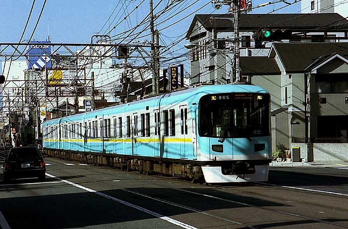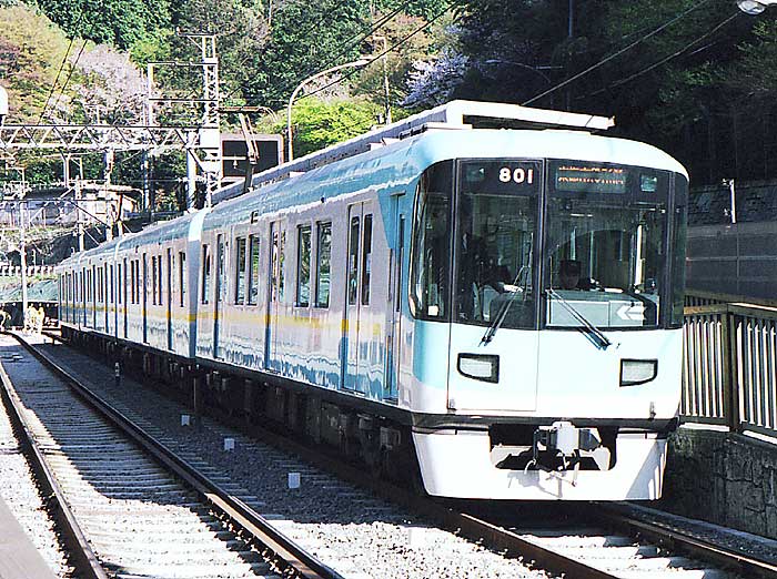 今月の友情出演は、先月の601・701に続き京阪の801です。 京阪は好きな私鉄の一つだったのですが、好みの車両は5000系まで。 それ以降はどうもいけません。 そんなことで関西に行った時に京阪間の特急車の乗り比べをする程度で すっかり足が遠のいています・・・(2006年9月 H・T) 京阪・京津線用の801です。琵琶湖畔の浜大津から京都の御陵(みささぎ)、 そしてさらにそこから京都市営地下鉄東西線の京都市役所前まで乗入れます。 この車輌、地下鉄内はATO・ホームドア対応のハイテク車輌ですが、 浜大津と上栄町間は路面を走り、また、大津〜山科間で最大61‰もある逢坂山を越える 登山電車でもあります。もちろん急カーブもあり、 運転室後にカブリツキで見る景色は変化に富楽しめます。 さらに地下鉄に入るとき運転室の遮光カーテンが電動で下りるのには驚かせられます。 さて、800系は地下鉄東西線の規格に合わせ、1500V仕様とし、 車輌の長さも大津線(京津線と石山坂本線の総称)の規格15mから16.5mに長くして1997年 (平成8年)に落成しました。ただ、車籍が入ったのは京津線の御陵〜京津三条間の最終営業日 (地下鉄開業前日)の1998年10月11日でした。大津線では、初のVVVFインバータ、 シングルアームパンタ、4両固定編成となり京津線に新風を吹き込んでいます。 京都、琵琶湖と言う観光地を走る鉄道らしく先頭車はセミクロスシートです。 なお、この800から「800形」ではなく「800系」となっています。 それまでの700形などでは制御電動車のみでしたが、 4両編成となり中間車の「850」が誕生したためで、 京阪は「系」と「形」を使い分けているようです。 また大津線はしばらく新車でも車体や電装品を流用していましたが、 この800系は35年ぶりの完全な新車となっています。 ちなみに35年前の新車は京津線の各停専用車であった80形で、 「8」を引継いだことになります。 (2006年9月 T・O) |