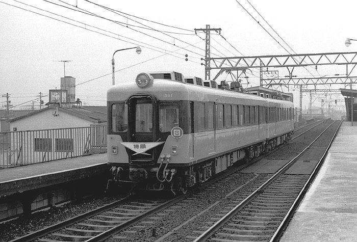 京都線は昇圧(1969年9月21日から)し、ホームなども改修されて大形車が入線していましたが、 京都〜橿原神宮、京都〜奈良行き特急にはまだ680系も使用されていました。 なお、この車輌にはパンタがありますがク581です。後がモ681と思われます。