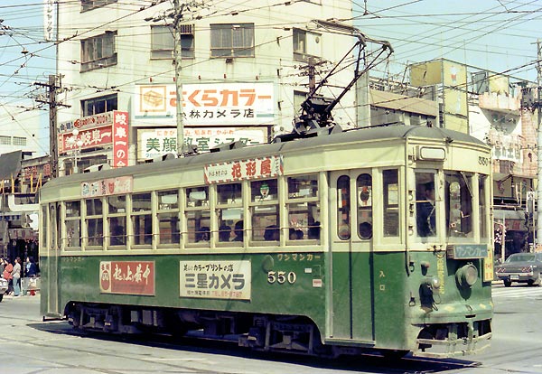 昭和42年(1967)岐阜市内線の木造単車を淘汰するため、全廃された北陸鉄道の金沢市内線から転入した小型ボギー車。元モハ2001(2000形)。スリムな車体で、路線バスより狭かったが、岐阜の町並みには似合った。