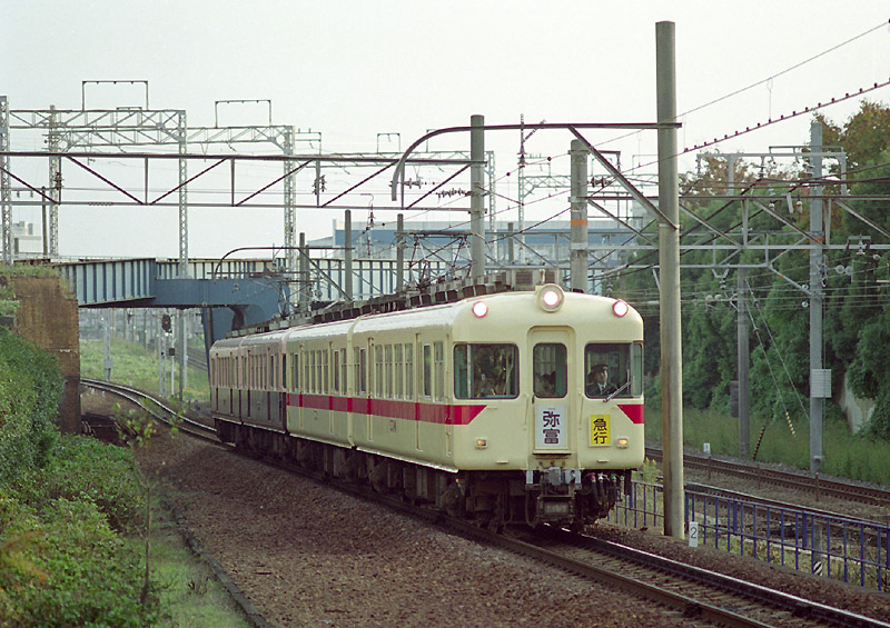 昭和36年になると7000系パノラマカーが登場し、特急の座を明け渡すことになります。 使い勝手がよかったのか、平成12年に豪雨による浸水被害で廃車第一号が出るまで全車健在でしたが、 これ以降は順次廃車となり、平成15年にリバイバル塗装を施した3編成が17年に廃車され形式消滅しました。 (2014年8月 H・T)