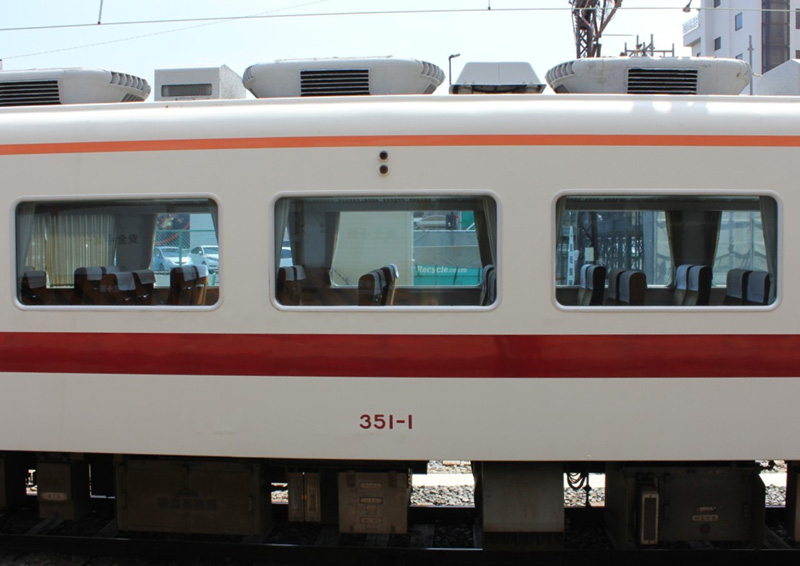 さて、前ふりが長くなりましたが、 350系は浅草〜赤城間を結ぶ特急「りょうもう」で運用されていた1800系を 1991年(平成3年)に転用改造した車両です。 鬼怒川線や日光線の勾配に対応するため、発電・抑速ブレーキを追加装備し、 6両編成を300系、4両編成を350系と称しましたが、機器の差はありません。 塗装は変更されていますが 座席は1800系からのリクライニングしない転換クロスシートのままとなっています。 製造から45年程経ており、 主に特急「きりふり」「ゆのさと」で運用されていた300系が2017年4月で戦列を離脱、 東武グループの中期計画で500系増備が発表されており 主に特急「しもつけ」で運用され、 臨時特急で「きりふり」や「ゆのさと」でも使用されるこの350系も引退間近と思われます。 (2017年6月 T・O)