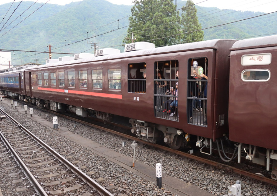 鬼怒川温泉駅を出発した「SL大樹6号」の2号車オハテ12 1。 展望デッキは人気があり家族連れなどで埋まっていました。 |