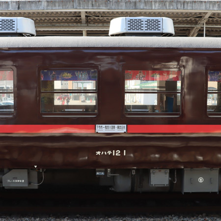 さて、JR四国から14系客車と共に東武鉄道へ譲渡されたオロ12 5、10の車体は錆で傷んでおり、 14系客車と共通部品が多く「部品取り用」と思っていたのですが、 2021年(令和3年)大改造されて営業復帰をしました。3列リクライニングシートを撤去し、 従来の12系客車のようなボックスシート(東武6050系の廃車発生品?)と大型テーブルを設置、 下今市側の扉と客室窓2つ分をオープンデッキ化し、トイレ・洗面所も撤去、 アテンダントカウンターとモニター付ギャラリースペースに生まれ変わりました。 形式が変更されて展望車を意味する「テ」を加え、「オハテ12形」、 オハテ12 1とオハテ12 2となりました。 さらに、オハテ12 1は旧型客車をイメージした「茶色」に塗り替えて、 客室窓下に赤帯が入りました。オハテ12 2は「青色」のままですが、 客室窓下に淡い緑帯を入れています。 オハテ12 1を組み込むスハフ14 5とスハフ4 501も「茶色」に塗り替えられています。 東武鉄道のSL列車にかける意気込みを感じました。 ただ、当初 2号車に組み込まれたオハ14 1やオハ4 505 ドリームカーの出番が無くなってしまい、 今後、どのように展開をみせるのか気になるところです。