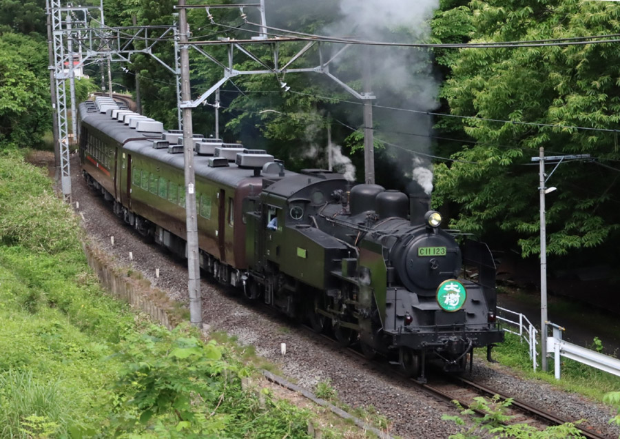 終点鬼怒川温泉に向かって、力強く坂を登る「SL大樹5号」です。 編成は、C11 123+スハフ14 5+オハテ12 1+スハフ14 501 です。C11 123の運転列車は、 ATSをSL自体に搭載できたので、ヨは連結していません。 2024年 6月 9日 新高徳〜小佐越
