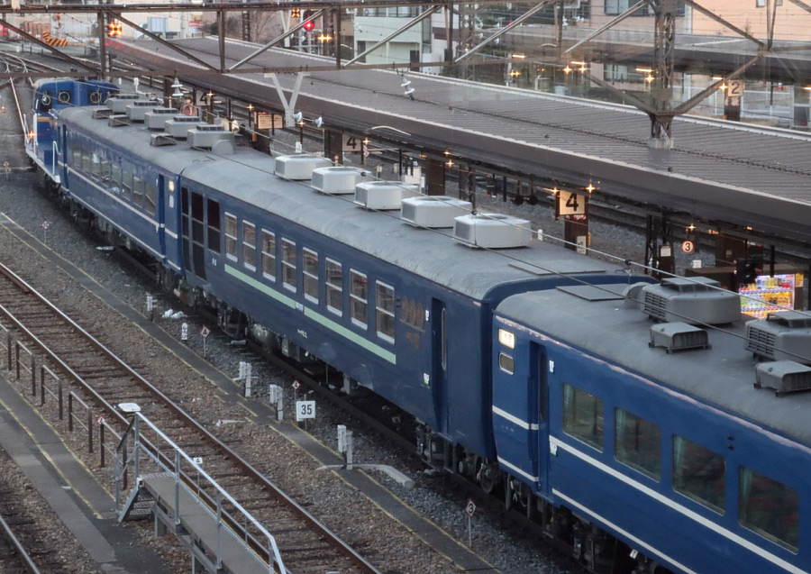 「青色15号」塗装のオハテ12 2です。よく見ると、12系と14系は、車高が違っています。 これは14系の冷房装置排気ファン部分に積雪対策でカバーを設置したため車両限界で 低くしたと言われています。よく見ると14系の冷房機にはカバーが付いています。 2022年 2月26日 下今市駅