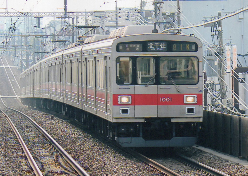 1000系は、老朽化した7000系(初代)の後継として、営団の03系、 東武の20000系と同時期の1988年(昭和63年)営業運転を開始しました。 日比谷線規格の3扉18m車で、主回路は、1986年(昭和61年)に登場した9000系と同じ VVVFインバータ制御です。