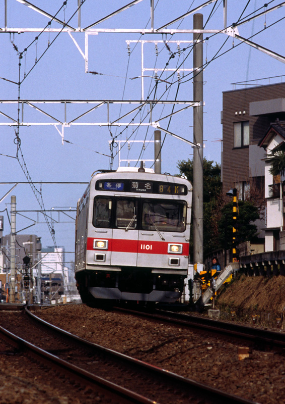 菊名行きのトップナンバー編成。先頭はクハ1101です。 このクハ1101は、クハ1701となり、現在も、池上線・多摩川線で運用されています。 |