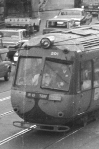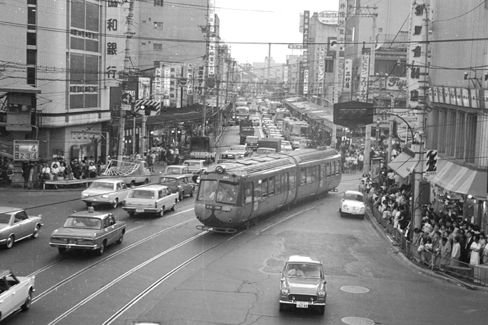玉電といえば多くの人がペコちゃんの愛称で親しまれたデハ200形を 思い浮かべるのではないでしょうか。 2車体連接式低床車とういうコンセプトは当時としては画期的であり、 各地で復活しつつある現在の路面電車に通じるものがあります。 そういう意味で200形はエポックメーキング的な車両であったことは間違いないでしょうが、 残念なことに当時としては技術的課題が多く短命に終わってしまいました。 デハ200形は1955年に登場し6両(2車体連接で1両と数えます)が製造されました。 玉川線・渋谷−二子玉川間、三軒茶屋−下高井戸間で運用されましたが、 特殊な車体構造のため保守性が悪く、渋谷−二子玉川間の廃止時に 世田谷線に継承されることなく全車廃車となりました。 現在、204号が宮崎台駅に移転した電車とバスの博物館に保存されています さて、上の写真は渋谷−二子玉川間廃止の日(1969年5月10日)に三軒茶屋の分岐点付近で撮ったものです。 この日までは三軒茶屋−下高井戸間も玉川線でしたが、翌日から世田谷線に線名が変更されました。 沿道には最後の玉電を見ようとたくさんの人がでています。 この日の様子は 「玉電最後の日」 に掲載しています。 (2007年5月 T.O@管理人) |