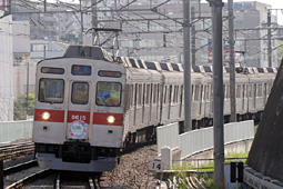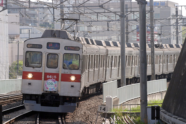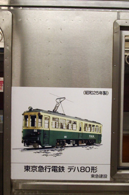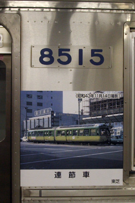2007年は玉電開通100周年・新玉川線開通30周年にあたっています。 これを記念して2007年2月26日から8月31日まで田園都市線で 記念列車が運行されました。 この列車はヘッドマーク(記念ロゴ)が掲出され、 車体には玉電や新玉川線ゆかりの写真やイラストシールが貼られていました。 |
