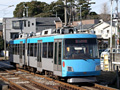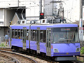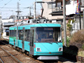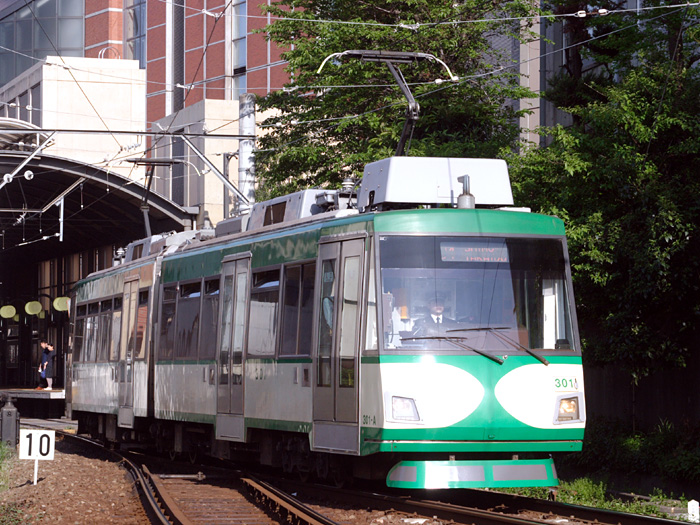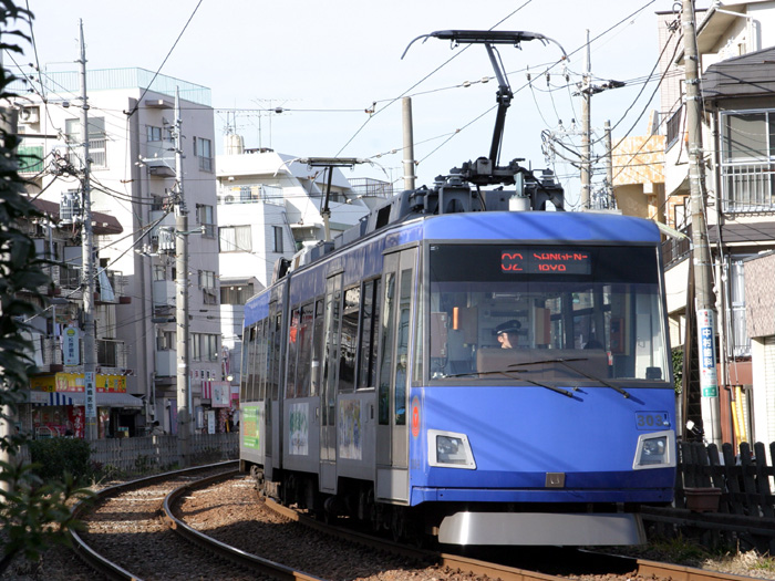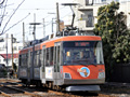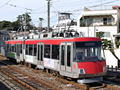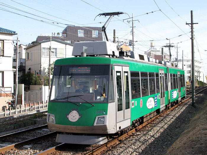 300系は東急の軌道線(いわゆる玉電)用車両としては1964年のデハ150形以来35年ぶりの新車です。 低床連接車のコンセプトはデハ150形ではなく デハ200形の流れをくむものです。 1999年から2001年にかけて10編成が製造され、世田谷線に残っていた80形や150形を駆逐しました。 車体は軽量セミステンレス製、VVVFインバータ制御が採用されています。 200形と同様に2車体連接で1両と数え、下高井戸寄りをA、三軒茶屋寄りをBと呼んで区別しています。 また、色は編成ごとに異なっています。300系のカラーバリエーションは下の写真をご覧ください。 300系のトップナンバー301は、登場時は上の写真のように 緑の車体にサザエさんのイラストが描かれていました。 (サザエさんの作者が世田谷に在住していたことにちなんでいます。) その後、2005年11月に旧玉川線200形車両登場50周年を記念して、下の写真のように 200形を模した「玉電カラー」(グリーンとクリームのツートンカラー)に 変更されています。また、同時にスカート部分にも200形の排障器に似せたステッカーが貼られました。 (2007年9月 T.O@管理人) |