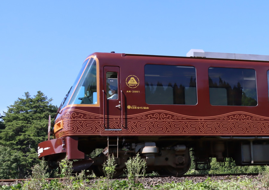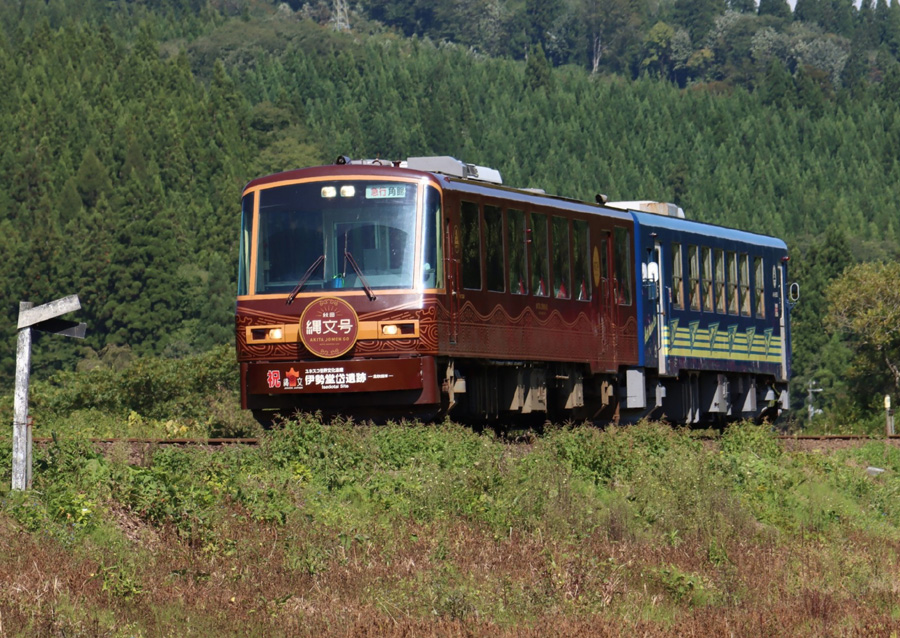 さて、AN-2001は、2000年(平成12年) AN-8900形をベースに新潟鐵工所で1両のみ製造されました。 転換クロスシート、天窓、運転室後ろにフリースペース、カラオケ設備、 冷蔵ショーケースを備えた団体専用車両として誕生しています。 2021年(令和3年)に、沿線の縄文遺跡群をイメージした観光車両「秋田縄文号」へリニューアルされています。