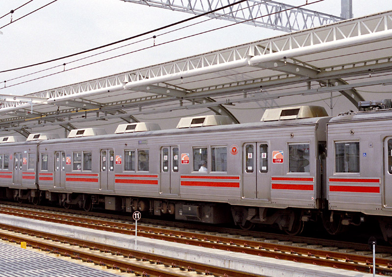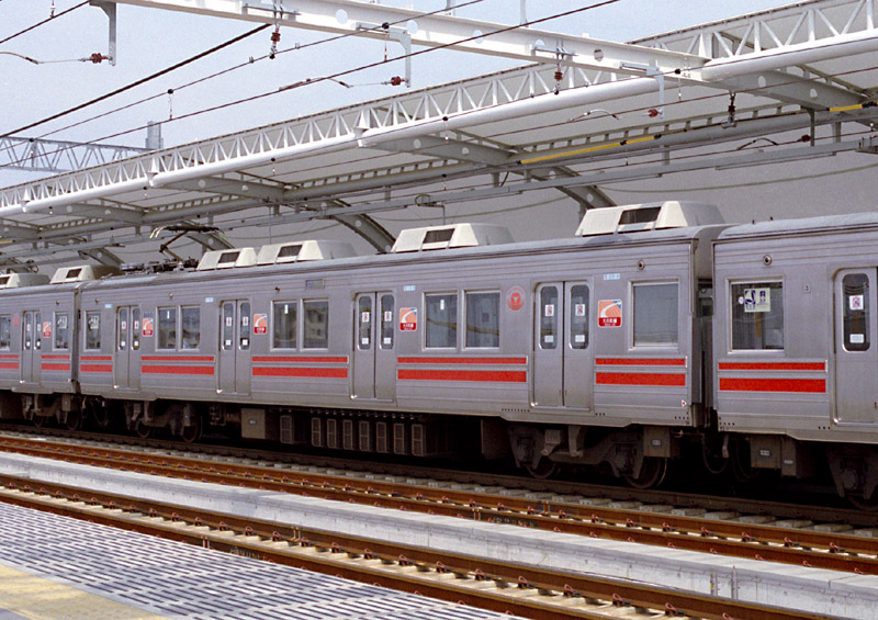 東急の8090系ですが、友人の話しでは、東急車輌が開発した軽量ステンレス車体の売込み用の見本とのこと。 5編成目で番号が行き詰ってしまう8090番代の形式をつけたのもそんな事情からでしょうか。(2013年7月 H・T)