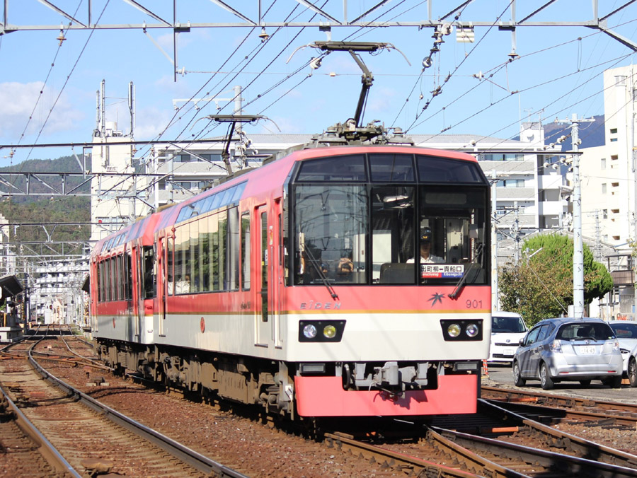 京都には何度も行きましたが、なにしろ興味の中心は客車、 好きな私鉄は阪急、それに京阪です。 中小私鉄はどうにも弱く、三千院に行った時に叡電に乗ったはずなのですが。 まだデオ900が生まれる前だったことは確かです。 今年最後の友情出演は、観光客を意識したデオ901をご覧ください。