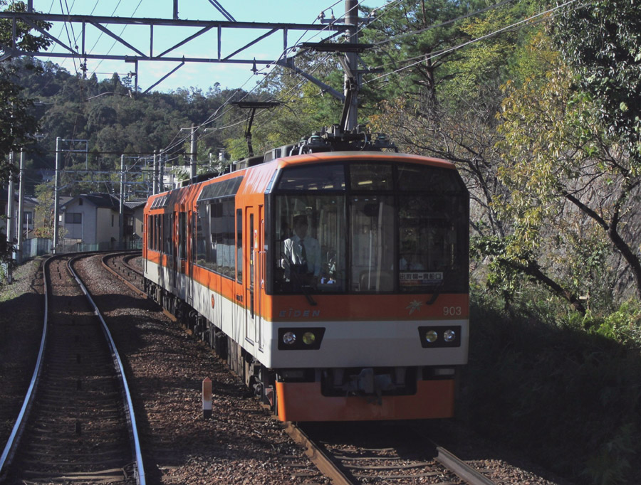 京福電鉄は、福井と京都に路線を持っていましたが、軌間、車両、 そして形式名称はバラバラで横の繋がりは低いものでした。ちなみに形式の「デ」は、 電動車を表し、「オ」は大形車と言う意味です。昔から、「叡山電車」や「叡電」と呼ばれ、 地域輸送を担っていました。しかし、1997年(平成9年)京都市営地下鉄烏丸線延伸で、 通勤通学客が移行すると予想されて、対策として沿線観光地に観光客を呼び込むために、 製造されたのが1997年登場の900系です。1998年に、もう一編成増備されています。 近畿車両デザイン室が外観、内装を取りまとめ、武庫川車両工業で製造されました。 眺望重視で、平面ガラスながら前面、側面ともに上部まで窓としています。 沿線風景に溶け込むように、901+902編成はメイプルレッド、 903+904編成がメイプルオレンジ色を車体上部に施しています。 座席は、1+2列で1列側は全て運転室向き、2列側は2席の運転室向き、8席の窓向き、 2組のボックスシートと一般車とは異なる座席配置です。