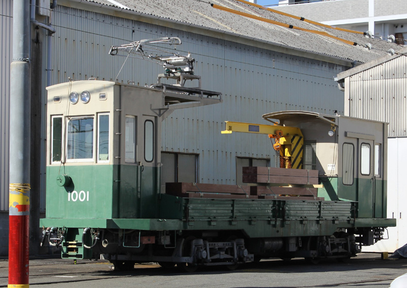 京福電気鉄道は、1974年(昭和49年)、保線などで使用していた嵐山線のモフ501と、 叡山線のデワ101を置き換えるため、嵐山線用にモト1001、叡山線用にデト1001を、 武庫川車両工業で製造しました。 両車両とも、モフ501とデワ101と同じく共通設計で、 10m級の無蓋車体とレール運搬可能な細長い運転室の電動貨車です。 主電動機と台車は京都市電600形から流用し、トロリーポール集電でした。 1978年(昭和53年)にポール集電方式を取りやめて、Zパンタ化されています。 なお、同じ会社でありながら形式が異なるのは、別個の会社が各々路線を開業し、 合併した歴史を表しています。 そして、1986年(昭和61)叡山線の分社化で叡山電鉄所属となりました。 デト1001は、叡山線・鞍馬線で保線用として、現在も使用されていますが、 ATSを装備しておらず、営業時間中は運転されません。