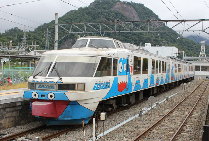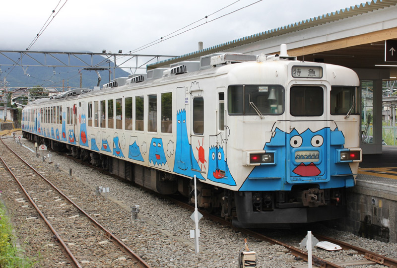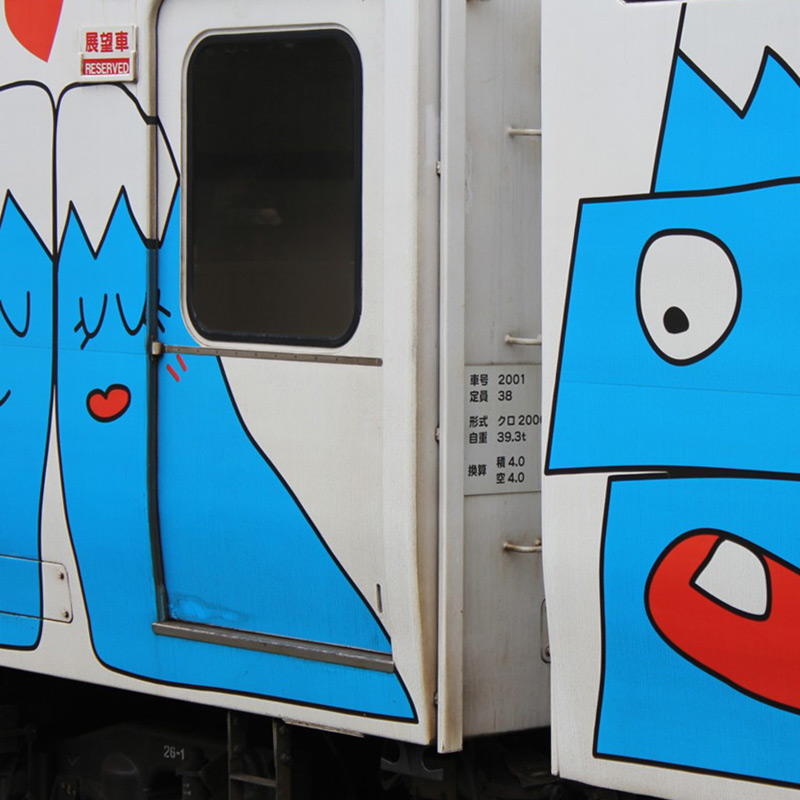 今回のトップナンバーは富士急行のクロ2001です。この車両は国鉄時代、165系を前面に展望室を設置、側面も大形固定窓に改造、 シートピッチを1,460mmまで広げ、中央線・大糸線の山岳風景を楽しめるようにした「パノラマエクスプレスアルプス」の先頭車でした。 JR東日本で2001年(平成13年)廃車となり、富士急行が購入したものです。 元々、3+3=6両編成で中間にも運転台がありましたので富士急行ではバラして3両編成X2本として「フジサン特急」として運用しています。 外装は白をベースにして富士山のキャラクターが描かれていますが、内装は「パノラマエクスプレスアルプス」時代と変わりありません。 クロ2000形の展望室やラウンジ席、中間車モロ2100形の低屋根部分にある個室も残されています。