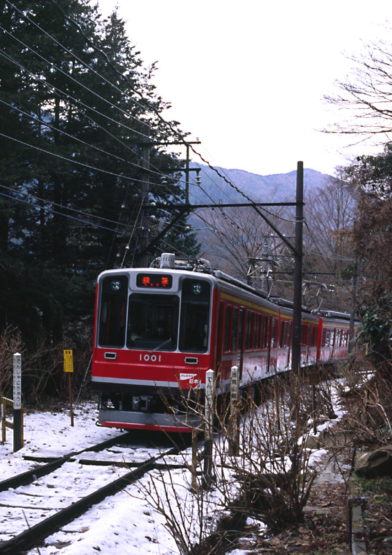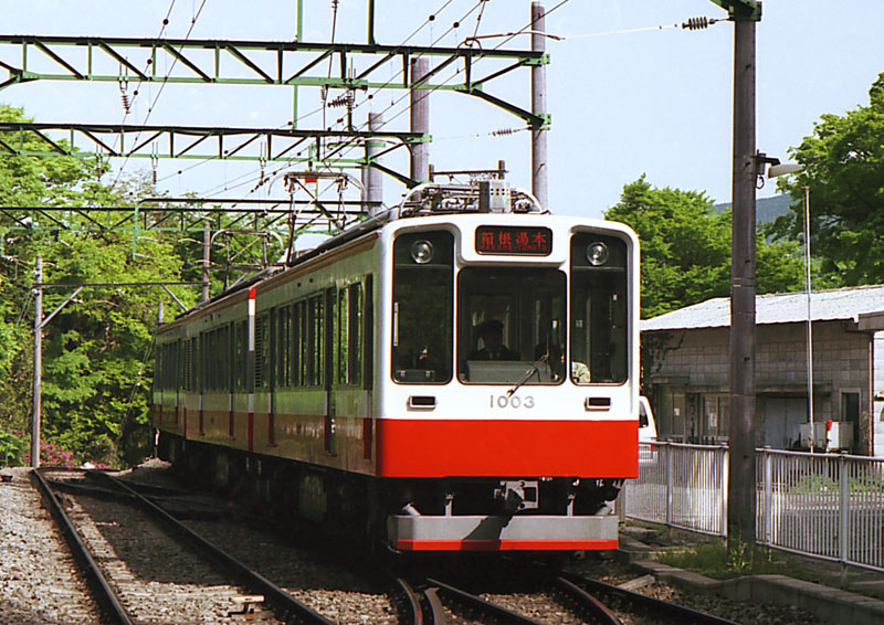 強羅から下ってきたクモハ1001+クモハ1002。この時は非冷房で貫通扉がありませんでした。 塗装は今は無き小田急HiSE10000形に準じたものでした。 1995年5月1日 大平台駅 |