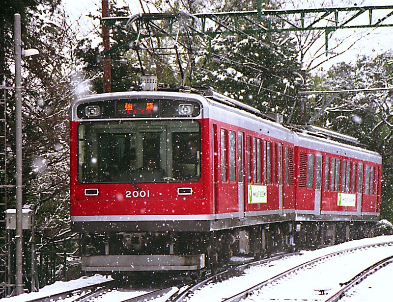 冬、関東平野にはほとんど雪は降りません。 冬の終りに八丈島沖を低気圧が通過するとたまに雪が降る程度です。 ところが箱根の山々は小田原が晴れていても、雪が降ることが度々あります。 この日も小田原は薄曇りでしたが、登山電車で登るにつれ、雪を見るようになり、 大平台はご覧の通り雪が降っていました。 そこに姿を見せたのが2000系のトップナンバークモハ2001+クモハ2002編成でした。