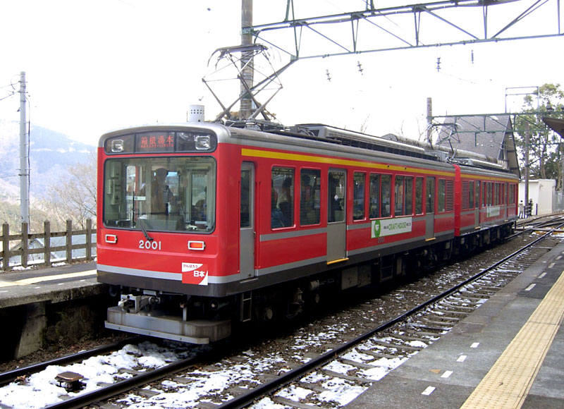 箱根登山鉄道は観光路線で土・日、祝日には湯本駅で積み残しが発生するようになりました。 そこで同社の創立100周年記念事業で、3両運転を行うことを計画、 不足する車両を補うために1989年(平成元年)竣工したのが2000系です。 但し、3両運転はホーム伸延や、600V→750Vへの昇圧などが完了した1993年(平成5年)からです。 電気指令ブレーキや並行カルダン駆動は1000形と同じですが、 床置き式冷房装置や非常時通り抜けのため連結面間に貫通扉を設けています。 さらに1995年(平成7年)には3両編成を増やすため中間車モハ2200形が誕生し3両化されています。 しかし、中間車は1000形の冷房電源供給車として1000形に組み込まれたことにより、 登場時の2両編成に戻っています。