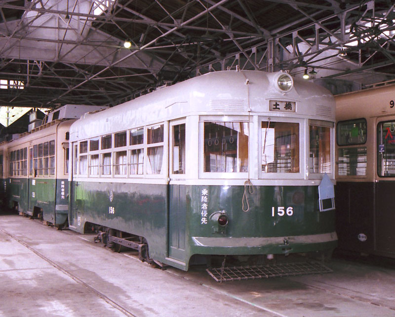 「101」復活で台車などを供出した「157」の同僚「156」。江波車庫で動態保存されています。 2004年5月15日 江波車庫