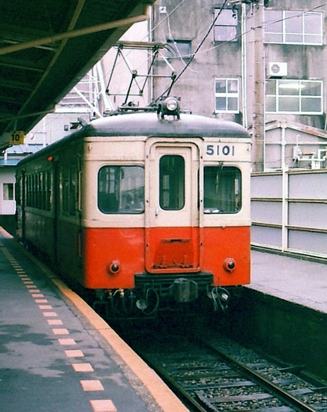 今回はここで撮った5100形を紹介したいと思います。5100形は1951年(昭和26 年)に石川総線用に広瀬車両で3両製造されています。2扉17m、ロングシートの 平凡なスタイルの車両ですが、面白いことに3両全てが北陸鉄道に在籍していな がら最終的にトップナンバーとなる経歴を持っています。(石川総線とは:野町 〜加賀一の宮間の石川線、1984年に廃止された加賀一の宮〜白山下間の金名線、 1980年に廃止された鶴来〜新寺井間の能美線が直通運転を行っていたための総称 です。)