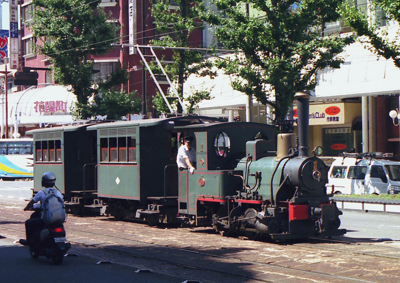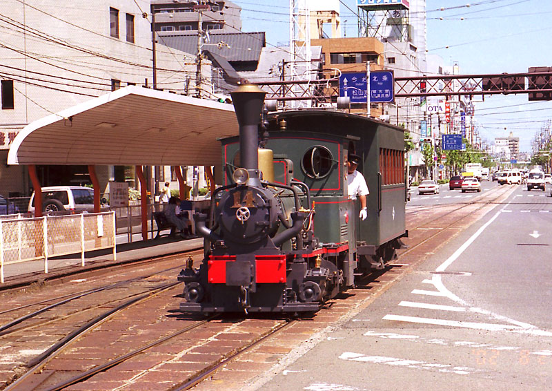 この車両は松山の観光活性化のため2001年(平成13年)、 軽便時代の伊予鉄道で走っていたドイツ・クラウス社製SLで、 夏目漱石の代表作「坊つちゃん」にも登場した甲1形を模して新潟鉄工所で製造されました。 松山市内線を走るため、SLとはいかずディーゼルエンジン駆動となっています。 翌2002年には甲5形を模したD2形D14号機が増備されています。