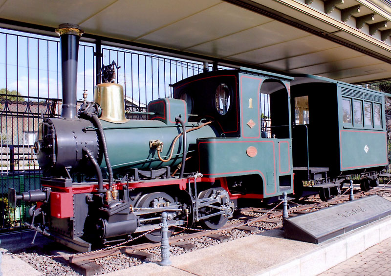 梅津寺公園に保存されている1号機関車とレプリカの客車です。これは762mm軌間に戻されていました。 2013年10月27日 梅津寺公園