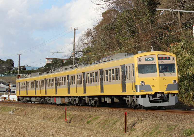 修善寺側の1号車クハ2201。新101系は西武でも現役ですが現在は前面窓廻りを黒色、車体は黄色一色となっています。 2017年1月12日 三島二日町〜大場 |