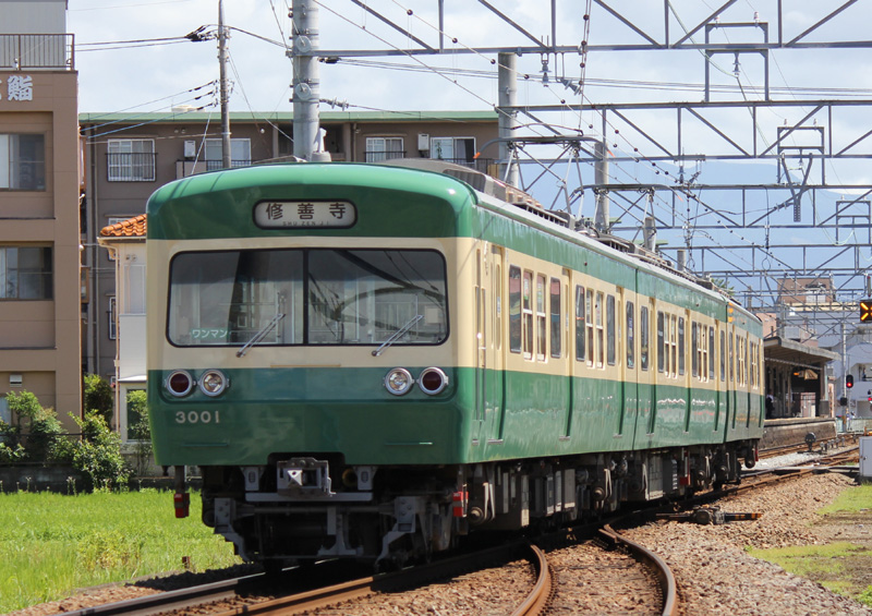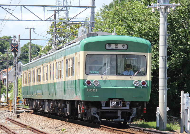 大場駅に進入するトップナンバー編成です。手前からクモハ3001+モハ3002+クハ3501。 |