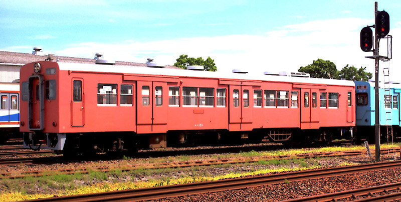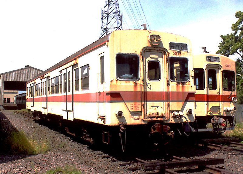 一方、関東鉄道は沿線に気象庁地磁気観測所が設置されているため、直流電化が出来ず、 増大する通勤需要対応で国鉄清算事業団から大量のキハ35系列の車両を購入しました。 そしてキハ300形(両運車)とキハ350形(片運車) として活躍しましたが老朽化で新製した車両に置き換えられ定期運用がなくなりました。 しかし、水海道〜下館間がワンマン化された時、 キハ300形にワンマン機器を搭載して、キハ100形へ形式変更された車両が生き残りました。 冷房化やディーゼル機関換装(DMH17H→DMF13HZ)をされていますが、踏切事故対策強化されず登場時の姿を保っています。
