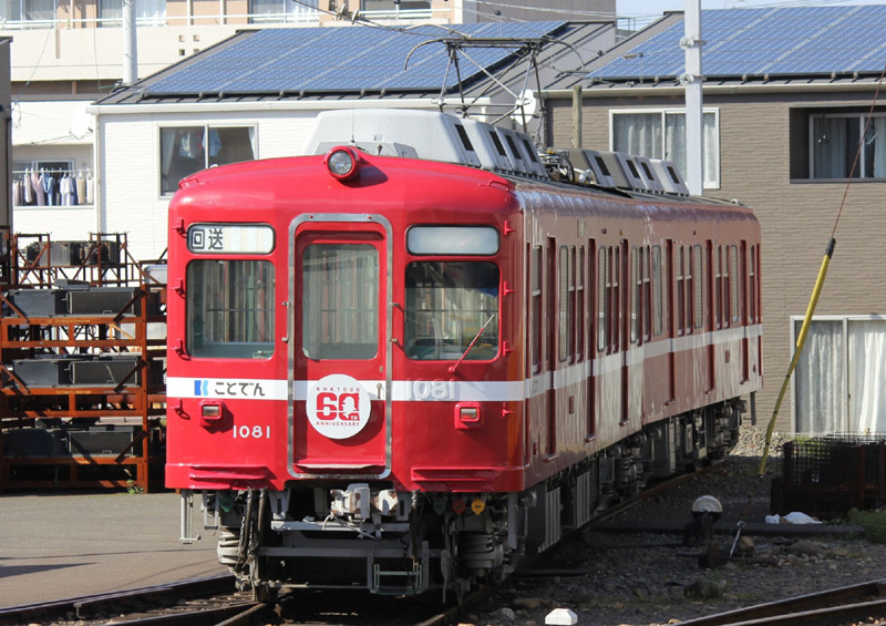 仏生山工場に留置中だった1081(手前)+1082編成です。 前面には「KHK1000 60th ANNIVERSARY」ヘッドマークが付けられています。 |