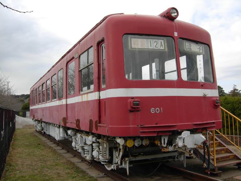京急1000形登場時は、 このような600形と同じ非貫通の2枚窓で浅草線乗入れ開始に伴い、 貫通式前面に改造されています。 写真は、逗子市第一公園で保存されているデハ601。 2008年1月31日 逗子市第一運動公園