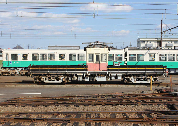 琴電の名物車「デカ1」後方にいるアイボリーホワイトと緑の車両が 長尾線のオリジナル塗装車です。写真は1305+1306編成。 2019年3月24日 仏生山工場