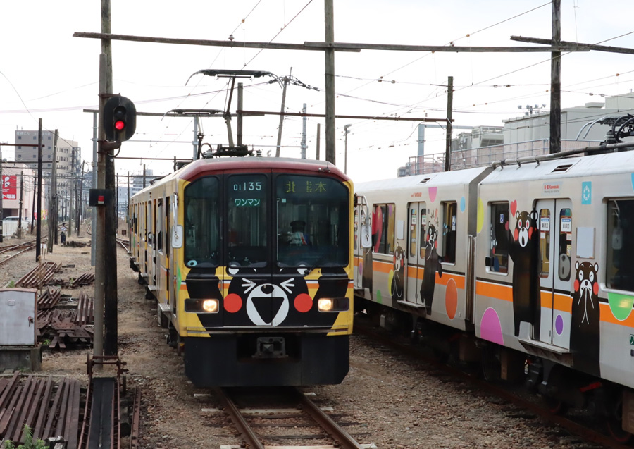 北熊本駅に進入する 01-135(手前)+01-635 です。 西鉄テクノサービスでの改造工事施工後、熊本電鉄に来た当初は、東京メトロ時代の外装でしたが、 その後、「くまモン」ラッピング車となりました。 |