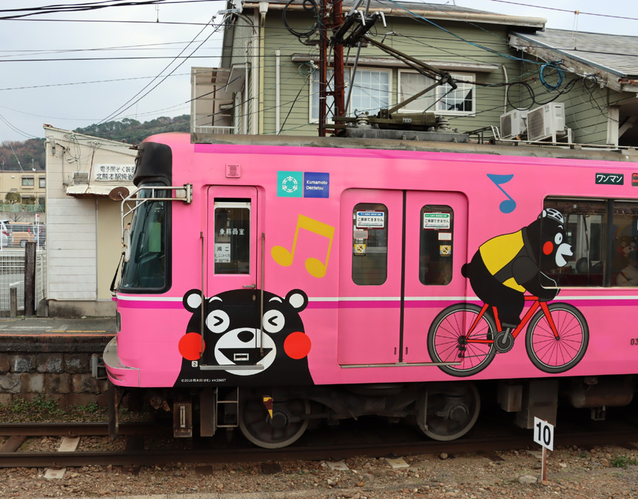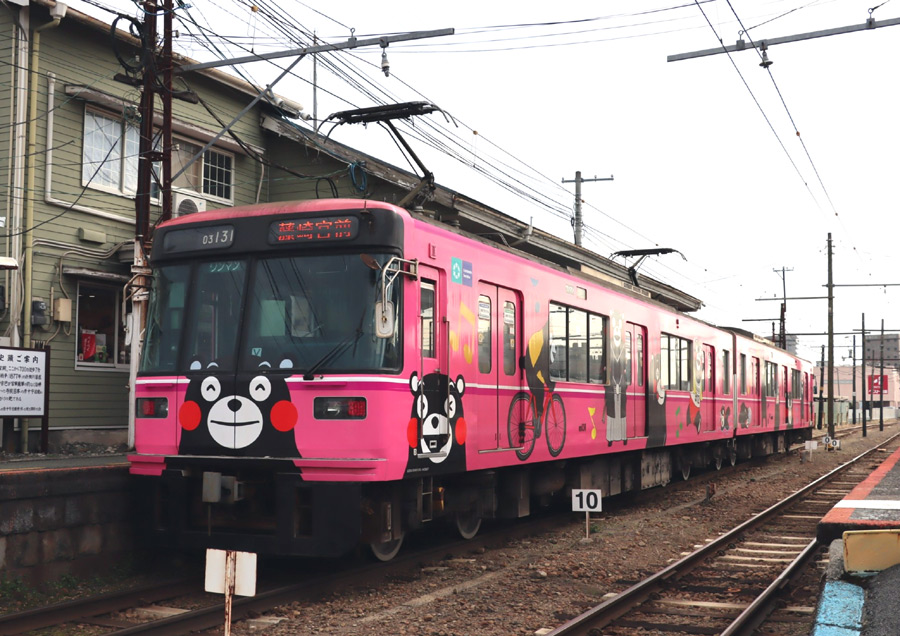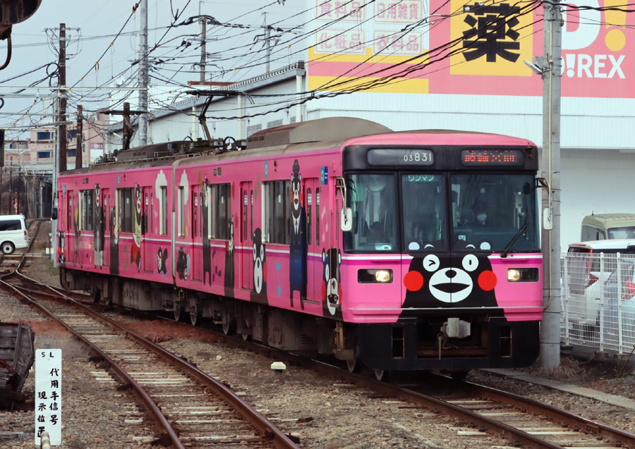 北熊本駅に停車中の 03-131(手前)+03-831編成です。 2023年10月からピンク色の「くまモン」ラッピング車となりました。 |