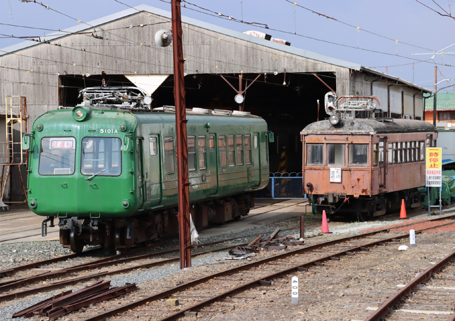 北熊本駅には車庫が併設されており、 ホームから保存されている元東急5000系だった5101Aや元国鉄90形 (初代、現可部線の広浜鉄道からの引継車両)モハ71を見ることができます。 この時、モハ71は、傷んでいましたが、 クラウドファンディングにより修理されて綺麗な姿になったようです。 2024年 1月28日 北熊本駅