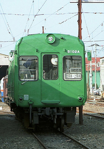 ジョルディスさんから上田の「まるまどまつり」の画像を掲示板に貼っていただきましたので、 今月の友情出演は東急5000系一族で最後の現役となった熊本電鉄のモハ5101Aをご紹介いたします。 (2006年5月 H・T) 熊本電鉄のモハ5101Aです。この車輌は、「青かえる」こと東急電鉄の旧5000系で、 1957年(昭和32年)にデハ5031として製造されたました。 1986年(昭和61年)に熊本電鉄に転入しています。熊本電鉄には、 1981年にモハ5043+モハ5044の2連が東急時代の番号のまま転入していますが、 5101Aは、両運改造されたため形式を改めて、改番されました。 当初、グリーンに黄色とオレンジ色の帯を巻いていましたが、 その後赤帯に上部グレーブルー、下部ブルーの熊本電鉄色となっていました。 2004年春に、東急時代のグリーンに戻されています。 東急の旧5000系は、中学から大学まで通学でお世話になり、非常に馴染み深い車輌です。 ただ、この車輌、タマゴを思わせるように裾が丸く絞られており、 停車するとステップのあるドアを除き、ホームとかなりの隙間が開きます。 昔、中学の大先輩が渋谷駅で隙間から線路に転落する事件を起こしたことがあると聞いたことがあり、 目の前に停まる度にそのことを思いだしていました。 東急を引退後は、長野電鉄、福島交通、岳南鉄道、熊本電鉄、上田交通、 松本電鉄へ譲渡され新性能化に貢献しましたが、 この殻形車体は屋根に冷房機を載せることができず、急速に姿を消しました。 熊本電鉄でも、5043(後に両運改造され5105)5044(こちらは改造されず廃車)を含め、 合計6両転入しましたが、次々廃車となり、 現在はこの5101Aが、5102Aとともに単行で上熊本〜北熊本間の区間運転に使用されるのみとなり、 この運用が全国で最後となっています。 なお、形式の最後の“A”はATS車上子を搭載したときにつけたものです。(2006年5月 T・O) |