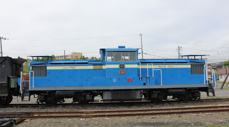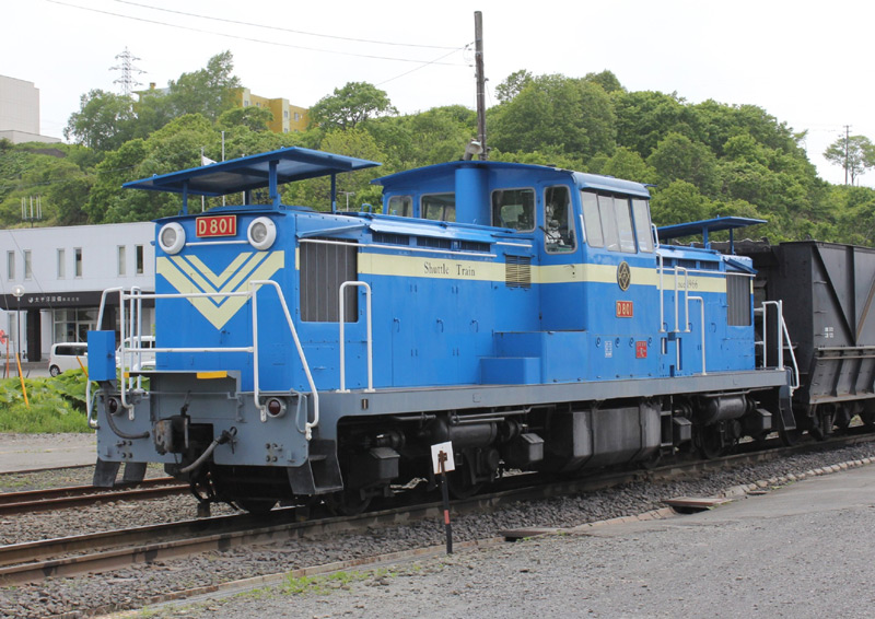 現在の太平洋石炭販売輸送が春採の釧路コールマイン選炭工場と釧路港東港区 石炭埠頭の知人貯炭場までの臨港線でDE601と共に活躍するD801です。 この2両が主としてセキ6000形石炭運搬貨車24両(連接車ですので12ユニット) を挟むPP運転を行っています。 春採の選炭工場では、2分割しそれぞれのDLが推進ないし牽引をして石炭積込み線に入れ石炭を積込み、 連結をして4km先にある知人の石炭桟橋まで運びます。 石炭桟橋に到着するとまた分割をして荷下ろしする作業を行っています。 なお、どちらかのDLが検査等で運行出来ない場合は、 予備機としてD401とD701がいますが、2018年時点でD401は除籍されています。
