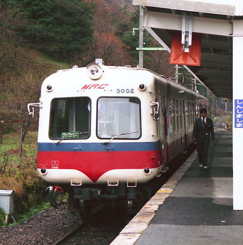 モハ5001の相棒、クハ5002はデハ5024を電装解除されて松本電鉄に入線しました。 なお、奇数車が電動車、偶数車が制御付随車となっています。 1993年11月21日 新島々駅 |