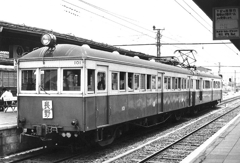 さて、長野電鉄のモハ101は1926年(大正15年)に須坂〜権堂間の開業に合わせ汽車製造株式会社(後に川崎重工が吸収合併) で2両製造された内のトップです。半鋼製車で運転席が中央にありました。 当時は100形でしたが1953年(昭和28年)に形式見直しで電装機器が同じだったモハニ130形を含め100系とされました。 長野駅地下化のため東急から5000系が譲渡され1977年(昭和52年)に廃車されました。