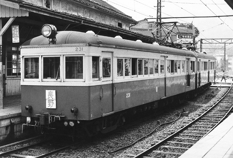 湯田中駅に停車中のモハニ231+モハ201編成。残念ながら200系トップのモハ201はモハニ231の後ろに隠れています。 200系は100系と外観は同じですが制御方式が100系のHL式(手動進段・架線電源式)に対して、 HB式(手動進段・補助電源式)にしたことで別形式となっています。