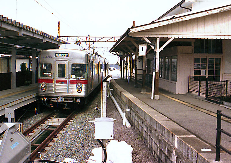 また写真では隣に2500系(元、東急5000系)各停が止まっていますが、行先表示が長野となっています。 現在、特急は長野〜湯田中間運転ですが、各駅停車は長野〜信州中野と信州中野〜湯田中に分離され、 直通運転はなくなりました。