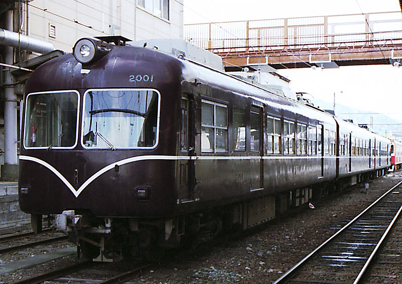 さて、2000系はこのトップナンバーを含む2編成が1957年(昭和32年)に日本車両で誕生しました。 ウェスティングハウス・エレクトリック社とナタル社が共同開発を行なった当時最新技術のWN駆動方式、 高速対応台車、セミモノコック車体、そして回転シートを採用するなど大手私鉄特急に負けない車両でした。 これを開発・製造できたのは、志賀高原へのスキーと観光客輸送を独占していた時代だからです。 その後、輸送量増加で1959年(昭和34年)、1964年(昭和39年)に1編成づつ増備され、 4編成で特急運用をこなしました。この頃、地方鉄道が一番輝いていた時代だったと思います。