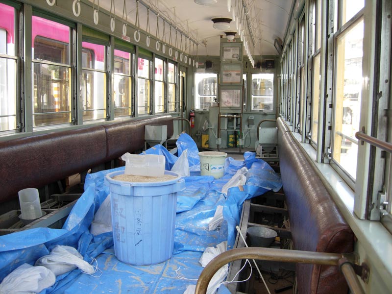 車内は座席を取り外しシートを引き、滑り止めの砂をいれてあるバケツが置かれています。